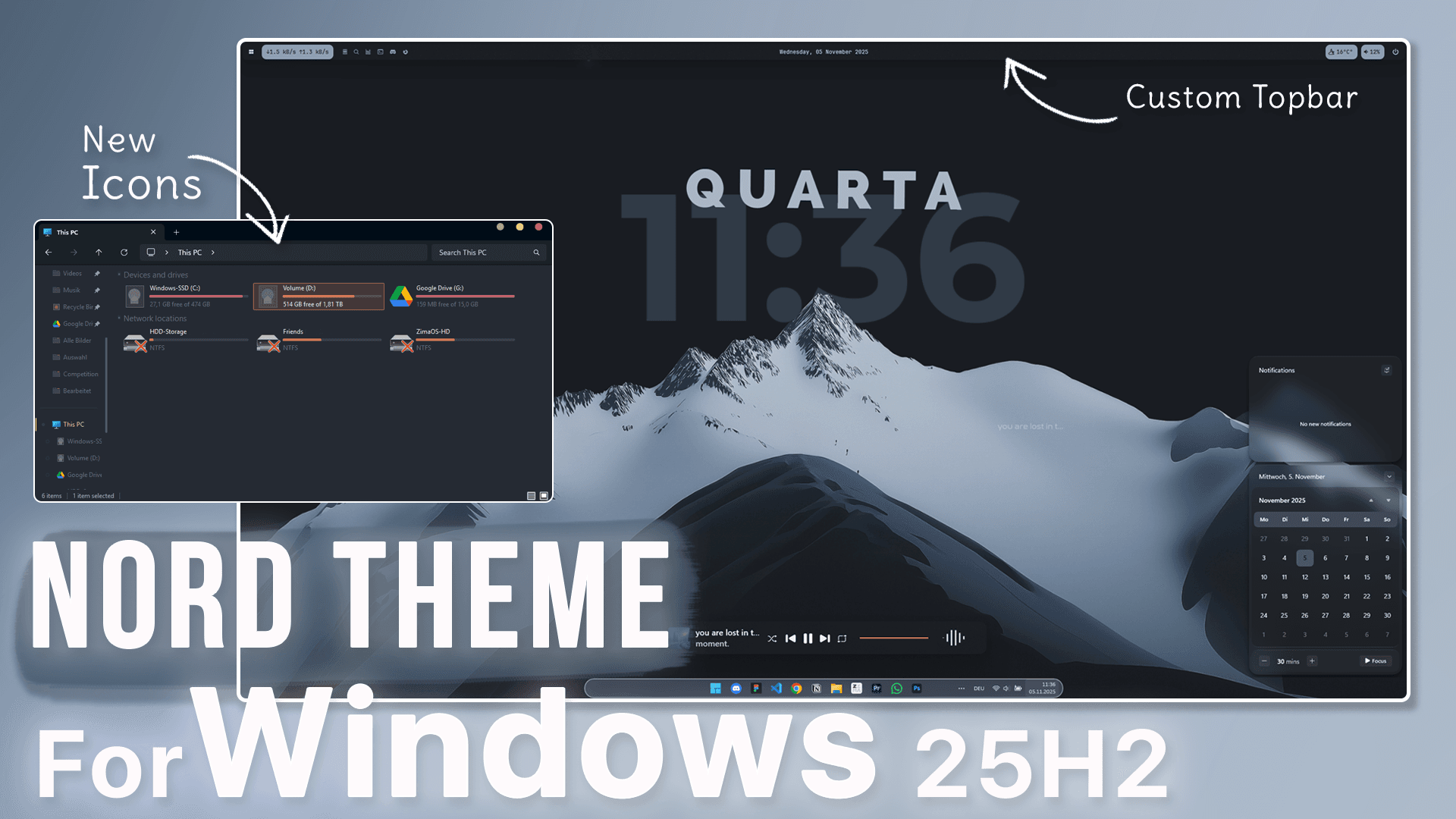 We use a premium-quality DRK-25 Nord UI theme together with matching icon packs, applied via Windhawk’s UXTheme Hook + Resource Redirect.